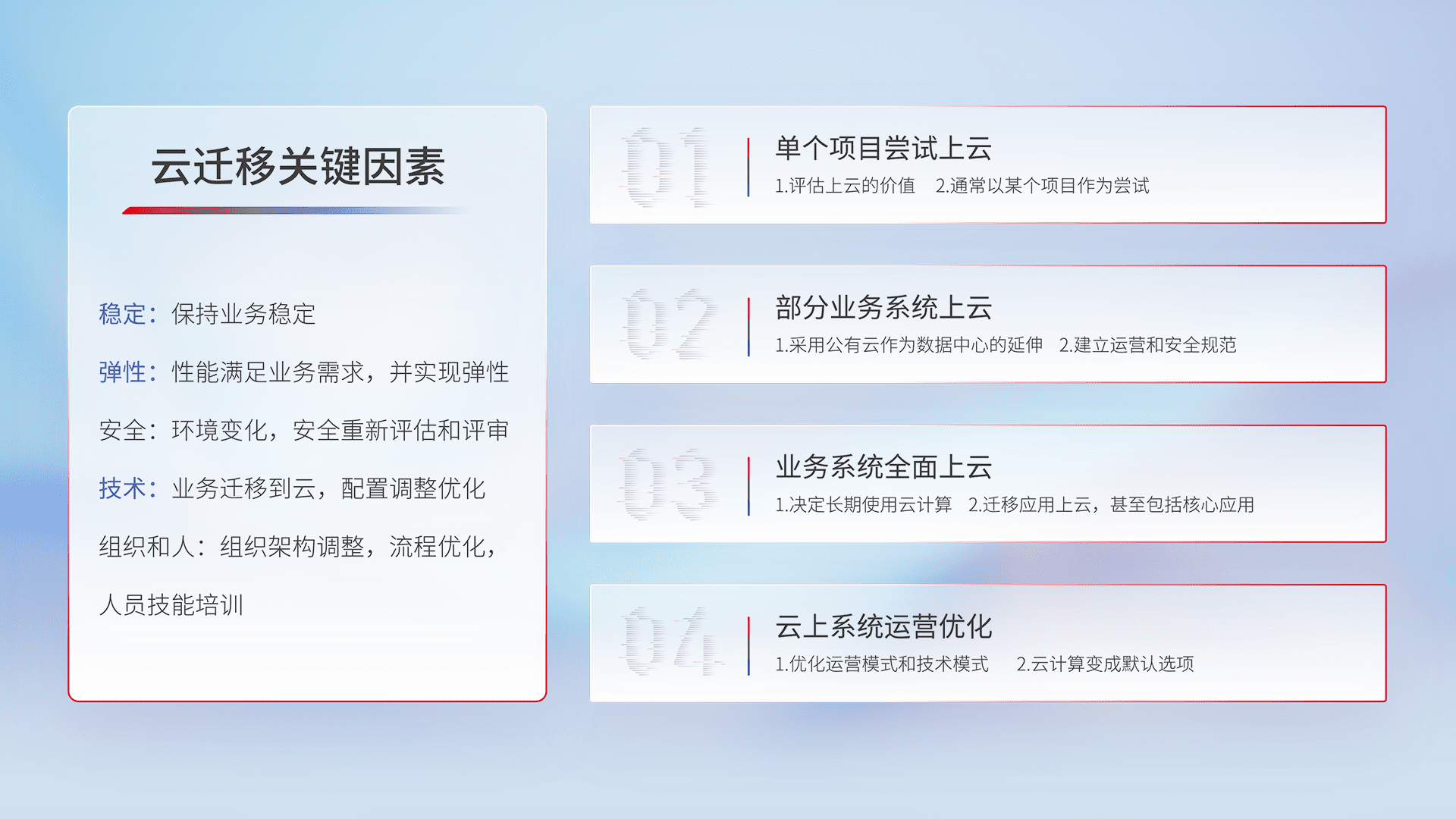 结合实际业务,,,从规划设计、、、、云平台选型、、、、云原生改造、、数据迁移、、、集成交付,,,迁移全过程为客户识别最佳上云路径,,,,做好风险识别管理,,,设计网络架构、、身份权限、、、、安全审计合规、、操作审计、、日志审计、、、、监控告警策略、、、、多站点容灾设计等,,,,对云上基础设施进行整体规划,,,,提升IT治理水平,,以满足弹性、、高可用、、、、高性能的需求。。