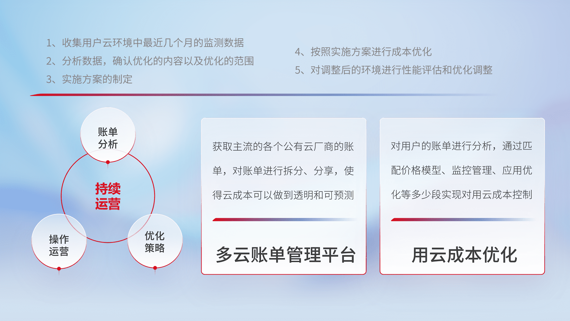 通过多云纳管,,以统一的资源数据模型把客户的云资源进行抽象和封装,,,进而实现对多云资源的统一操作,,,保障云资源管理的可靠性、、、稳定性与可用性。。。量身定制化运维内容,,配置、、开发运维、、、补丁管理、、备份、、监控、、、认证和访问管理、、审计和日常巡检等,,,,保障在用云过程中的可靠度,,,,稳定度以及高可用率。。。